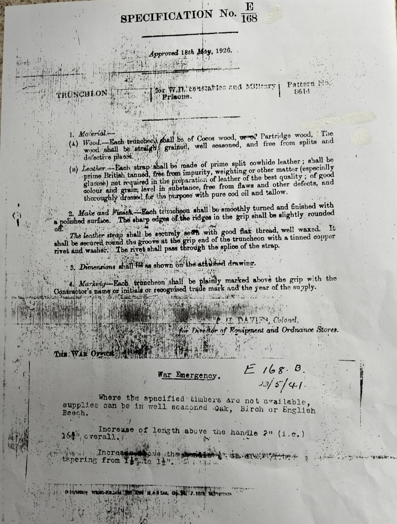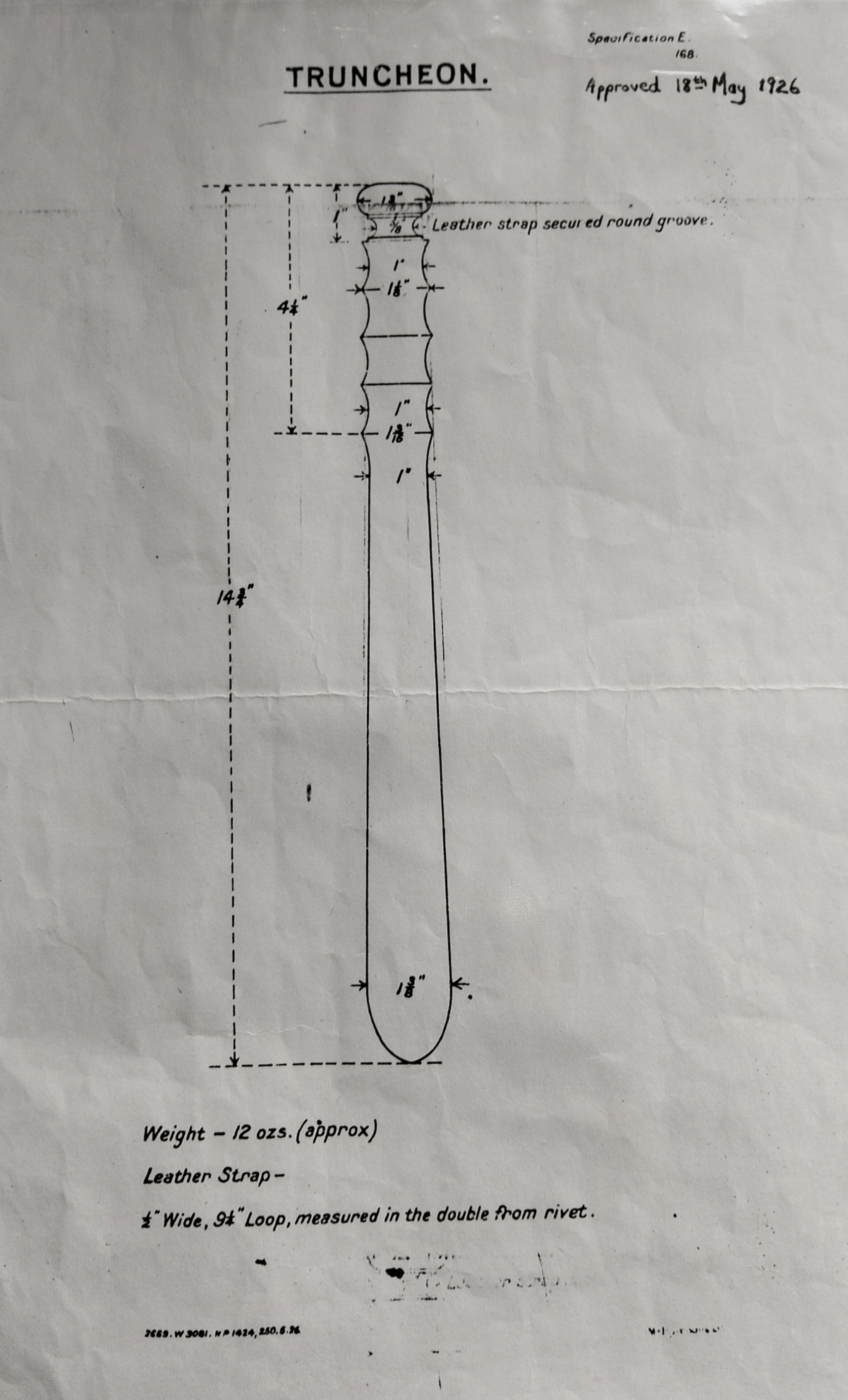 In May 1926, the War Office approved Specification No. E168, formally covering “Truncheons for War Department Constables and Military Prisons”. This document is not a guideline or a suggestion. It is a proper procurement specification, spelling out materials, dimensions, finish, markings, and even how the leather strap was to be made.