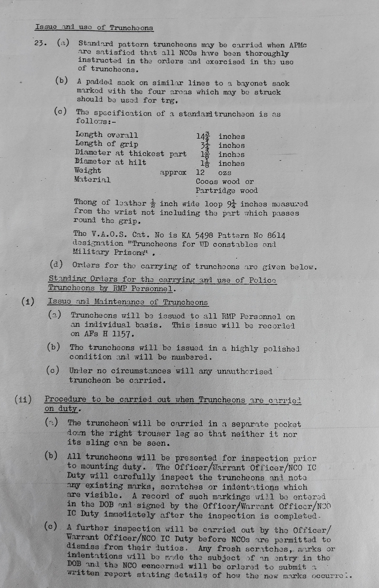 Dimensions, general form, finish, and the requirement for a proper leather thong were all retained. The truncheon was still expected to meet the same functional and handling standards set out in 1926.